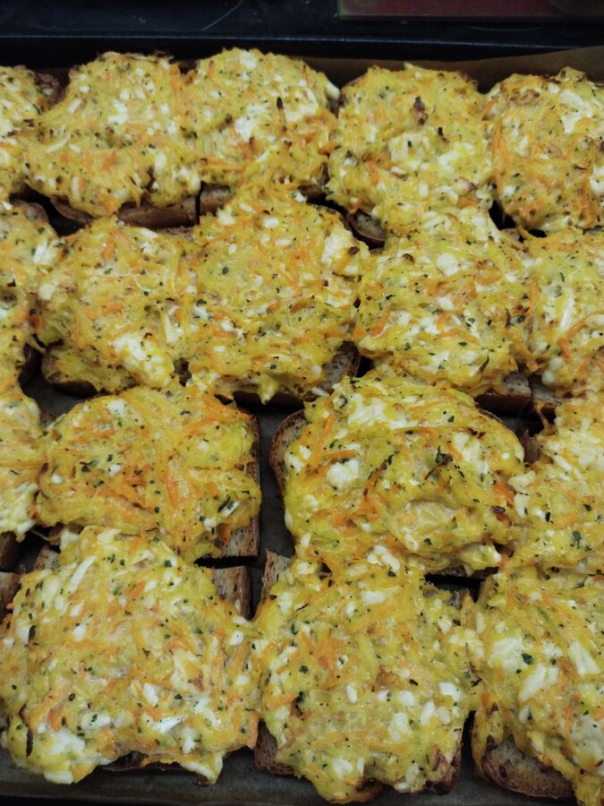 В оригинале надо положить "начинку" на хлеб и этой стороной на сковородку, а потом обжарить вторую сторону. Но так как мой организм не очень дружит с жареным, то я запекаю их в духовке.