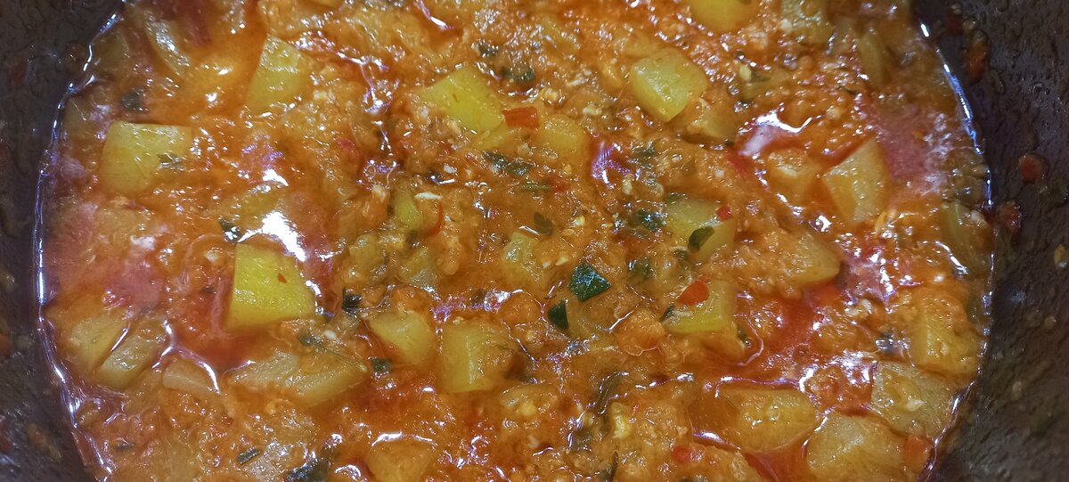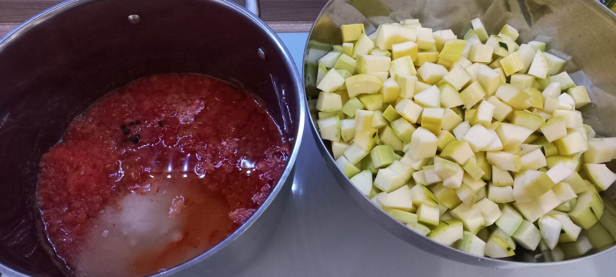 На мясорубку помидоры, болгарский перец и острый перец. Добавить соль, сахар, раст масло, перец горошек. Поставить на плиту, после закипания добавить кабачки, нарезанные небольшими кубиками.