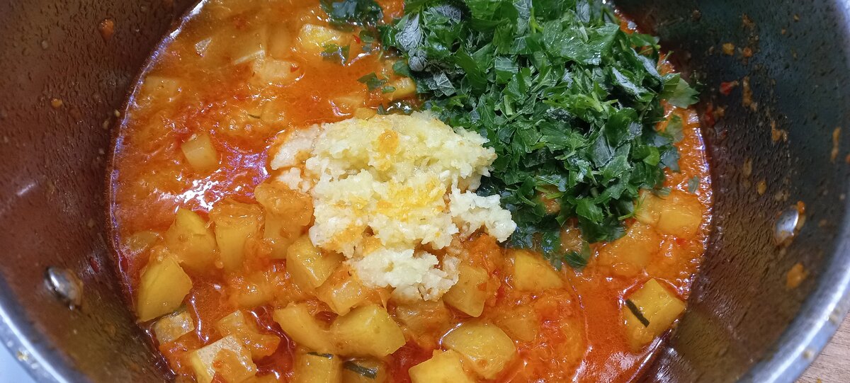 Тушить, помешивая, на сильном огне!!! 30 минут до выпаривания жидкости. Добавить нарезанную петрушку, чеснок, пропущенный через пресс, уксус.