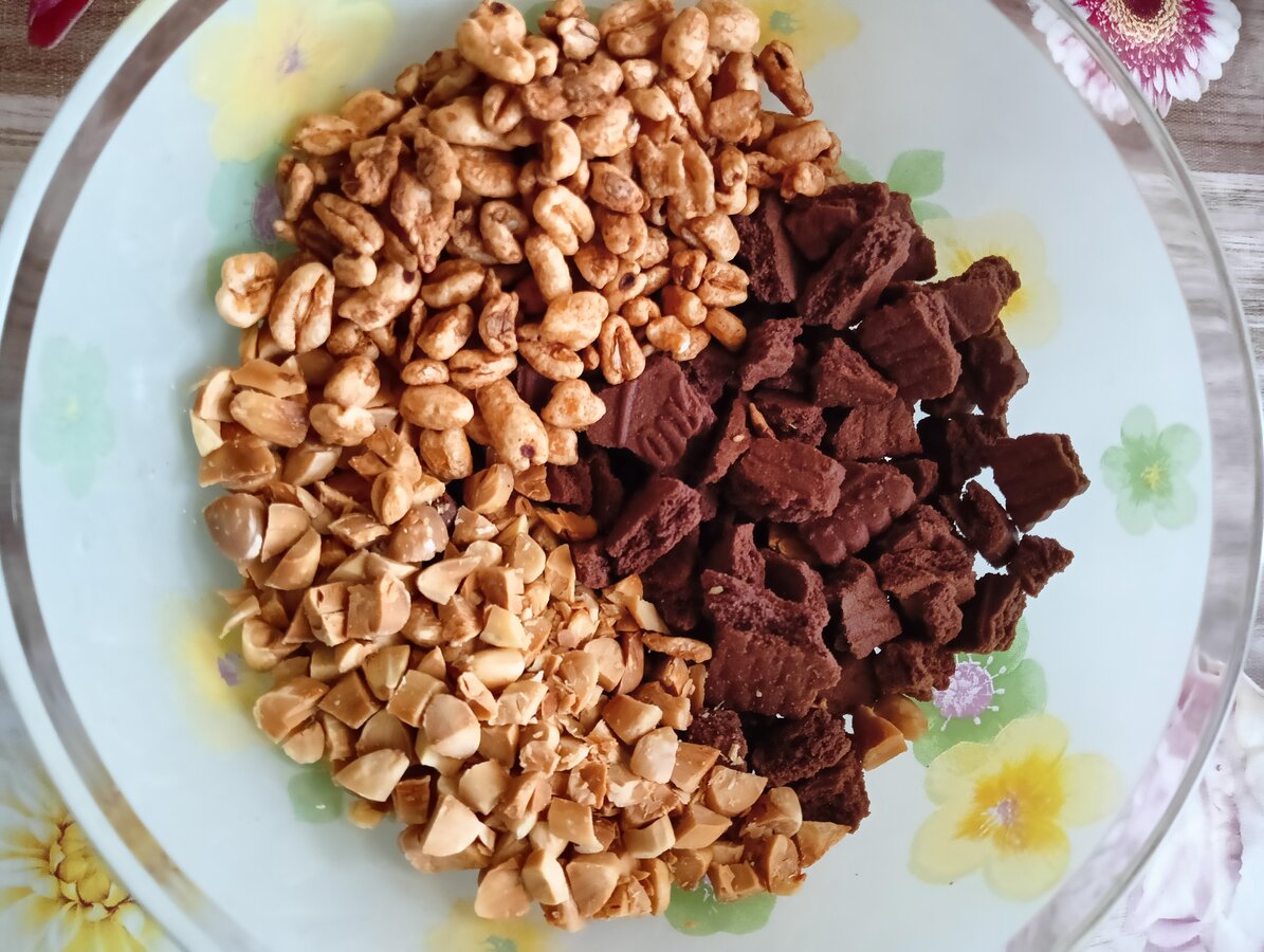 Сегодня печенье, обжаренный миндаль и дутый карамельный рис. Шоколад молочный и темный.