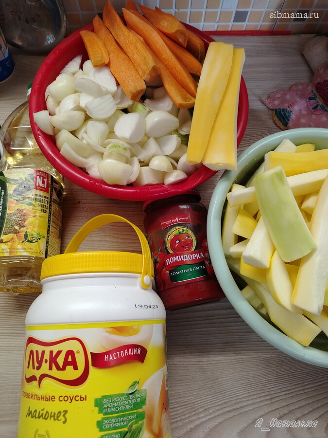 Овощу перекрутить на мясорубку, добавить майонез, томатную пасту и масло, пару листиков лаврушки, варить час, переодически помешивать.