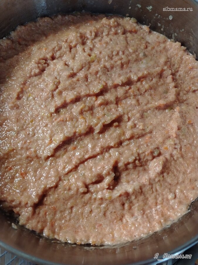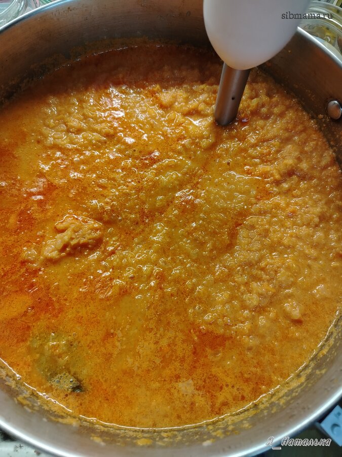 Спустя час добавить соль и сахар, лучше частями и пробовать, и варить ещё час, после достать лаврушку и добавить уксус, и перебить блендером, довести до кипения, разложить по баночкам и закатать.