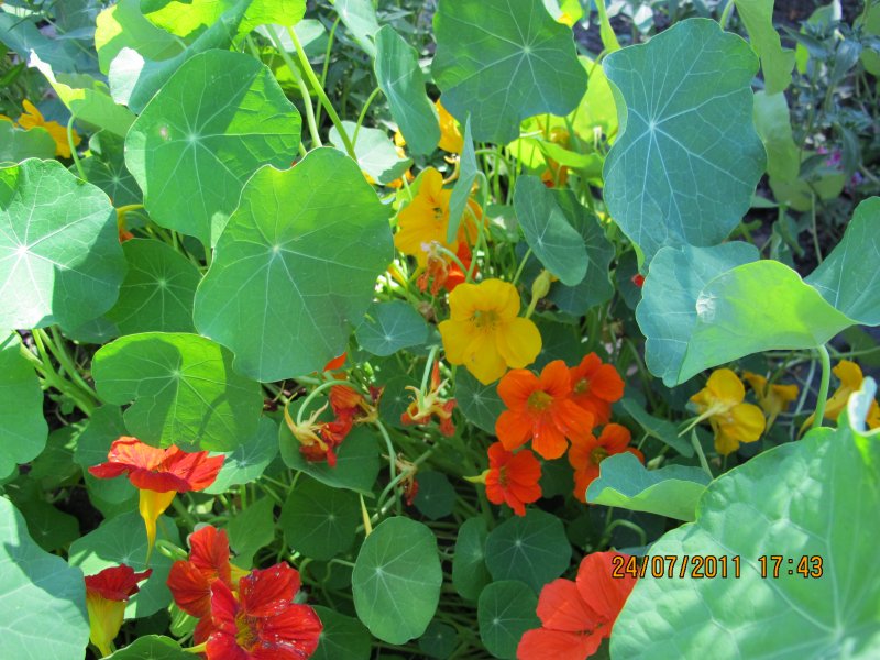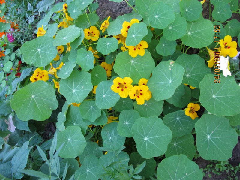 ...настурция лучшее растение для приствольных кругов плодовых деревьев и ягодных кустарников (2–3 растения на кв.м). Многочисленные стебли растений буквально расползаются во все стороны, закрывая листвой почву, тем самым тормозят развитие большинства сорняков, не давая им обсемениться. Почва под таким ярким одеялом всегда влажная! Зимой растения отмирают, но их корни привлекают дождевых червей.