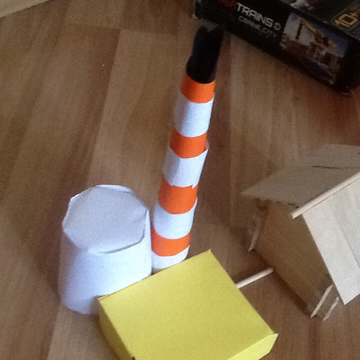 1. Из бумаги клеим станцию. Котел, печка, труба. Можно ограничиться трубой и коробкой, предварительно понаблюдав на улице дым.