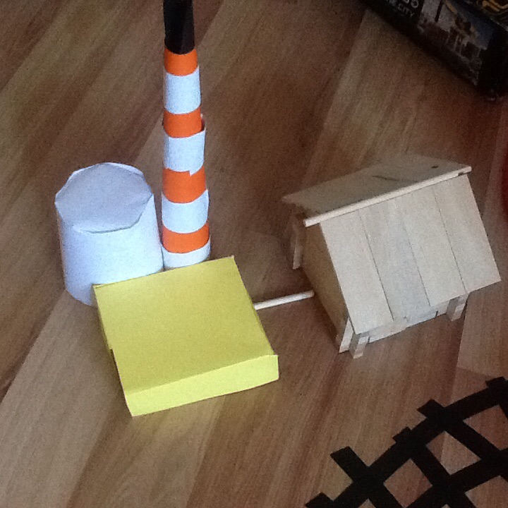 Нам понадобиться: игрушечный паровоз, рельсы, бумага, клей, домик, аналог трубопровода.