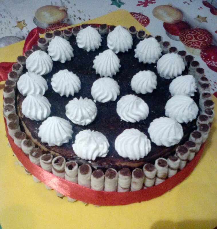 Торт к чаю. Два бисквитных коржа, между ними промазала вареной сгущенкой с безе. Сверху ганаш из шоколада и оставшиеся безе. (Безе покупные). |