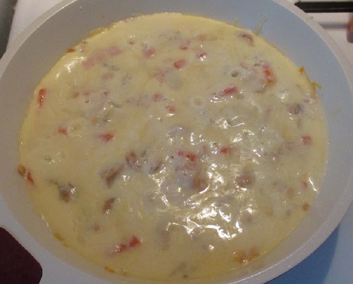 5. Комфорку переключила на минимум, вылила омлетную смесь в сковороду. Закрыла крышкой.