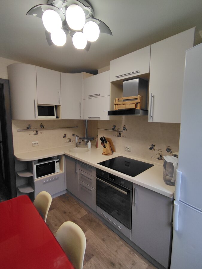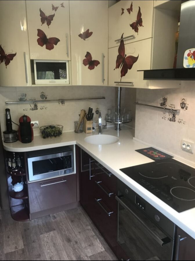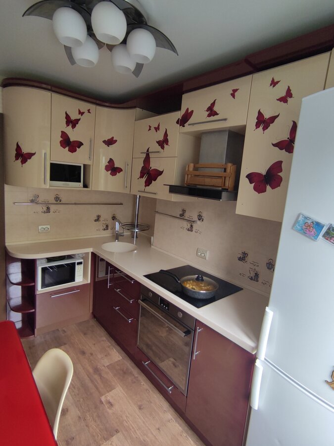 В сентябре на меня вдохновение нашло. Я давно хотела что-то с кухней сделать, полгода живу, а она меня раздражает, с красными бабочками на бежевом, сама бордовая, стол красный. В общем, смотрите, что получилось. Я довольна как слон. У меня подруга есть, всё красит! Вот как раз они в гости пришли и вдохновили меня.