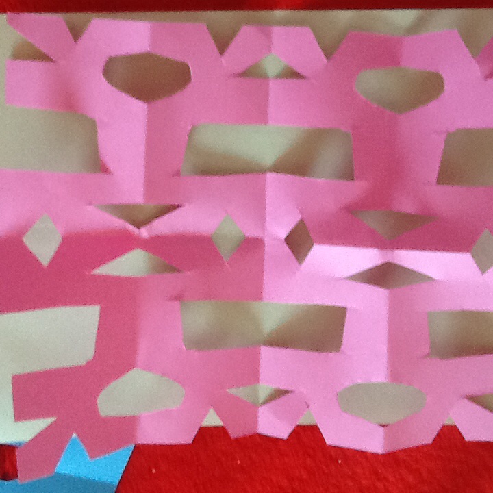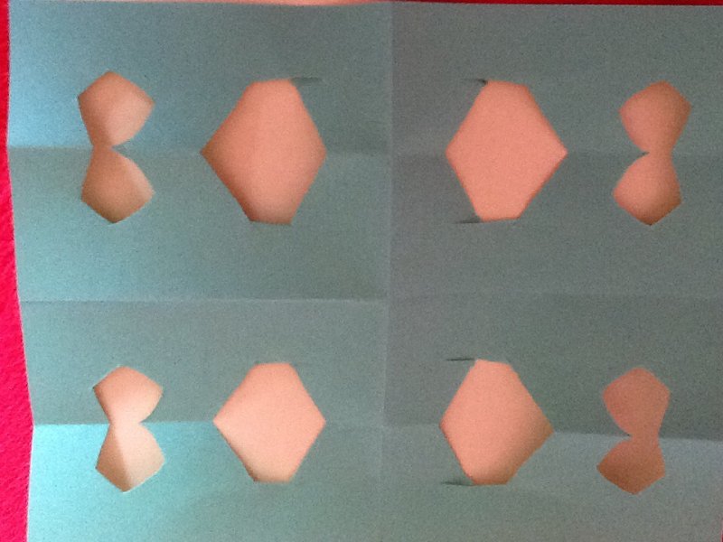 3. Смотрим, что получилось, складываем обратно, раскладываем, смотрим, что фигуры повторяются и одинаковы. Коврики, бабочки, снежинки.