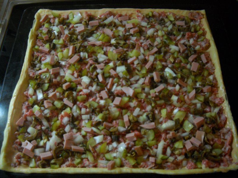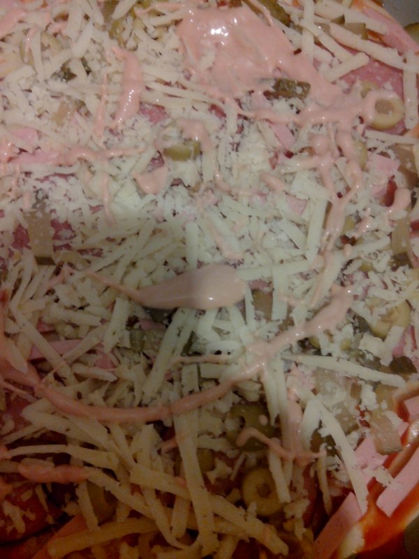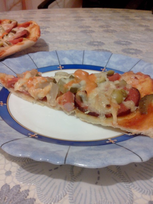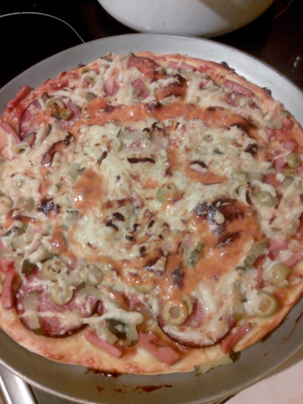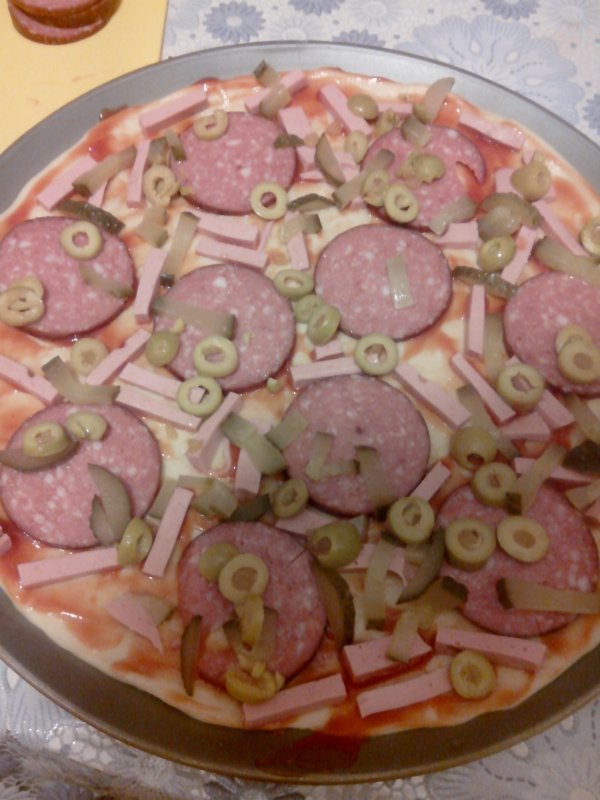 250 мл теплой воды (делю пополам, в половине растворяю 2 ч.л. сухих дрожжей), 600г муки, 1 ч.л. соли, 5 ст.л. растительного масла (в оригинале - оливкового). Замешиваю тесто и оставляю на 30 минут. Получается 2 большие пиццы. Раскатываю по размеру листа, смазываю соусом (майонез, кетчуп 1/1). Начинка бывает разная всегда, сегодня: фарш, лук, грибы белые, огурчик маринованный, немного вареной колбасы, помидоры, сыр, майонез. В духовку на 30-40 минут. Сын сказал, что такой вкусной пиццы раньше никогда не ел (наверное по маме очень соскучился :oops: :haha: )