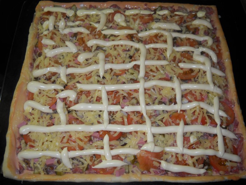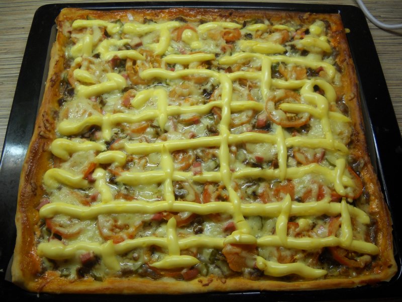 Мы сегодня делали так. Пицца получилась с тонким мягким тестом, очень сочная и сырная. И полезная - без майонеза, кетчупа и колбасы. ;)