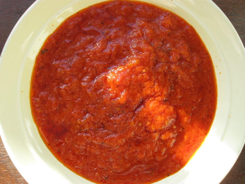 Томаты в собственном соку очищаем от кожицы, разминаем, добавляем нарезанные дольки чеснока, базилик, оливковое масло. Увариваем на сильном огне пока соус не загустеет. Чеснок убираем.
