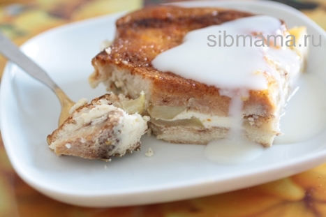 Форму смазать маслом. 4 кусочка хлеба тонко намазать апельсиновым джемом. Выложить на дно формы. Яблоки очистить, тонко нарезать, выложить на хлеб, посыпать половиной порции корицы. На яблоки уложить 4 оставшихся кусочка хлеба, посыпать 0,5 ч.л. корицы. Сливочно-яичную смесь вылить в форму. Запекать при 170 градусах 40 минут. Если верх пудинга будет пригорать, прикройте его фольгой.