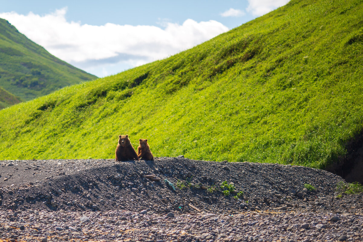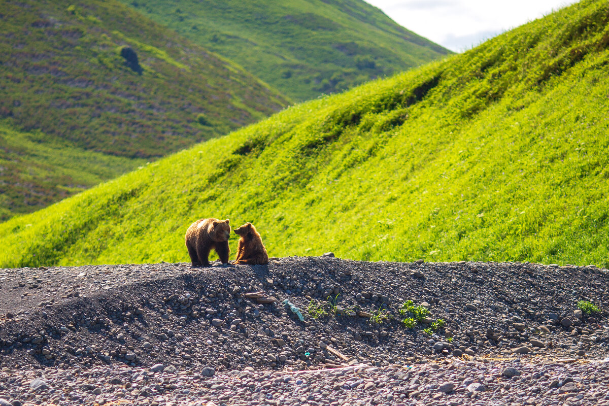 Но долго задерживаться в этой бухте мы не могли - пришло время отправляться в путь. Проходя мимо одной из бухт, увидели на берегу дремлющих медведей. Как же пройти мимо? Завернули к ним. Медведица лениво подняла голову, но, к нашему разочарованию, никак на нас не отреагировала, лишь повернулась на другой бок. Наши призывные крики ее не понуждали ни к какой активности. Пришлось нашему капитану достать "сигнал охотника" - металлическую трубку с пистоном. Она издает резкий звук, похожий на выстрел. Только после этого медведица лениво поднялась, повела носом и неохотно побрела прочь от нашего назойливого внимания