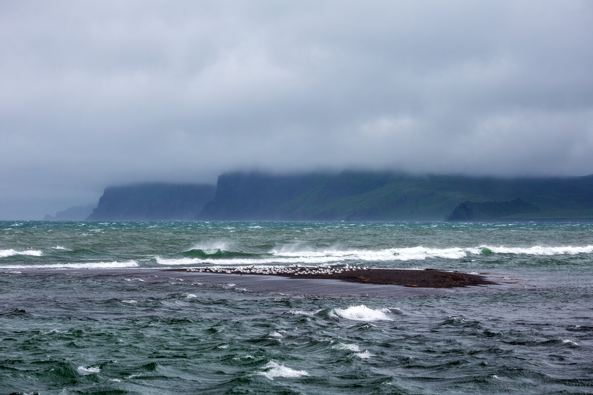 Остров Анциферова встретил нас туманом, волнами и ветром. В серой пелене на скалах лежали уже привычные всем сивучи разных возрастов.
