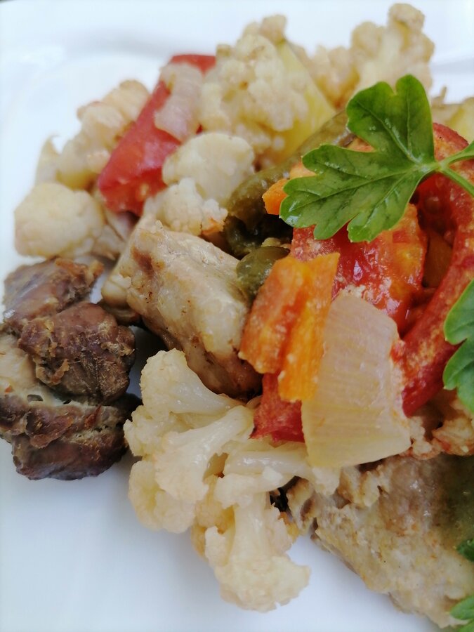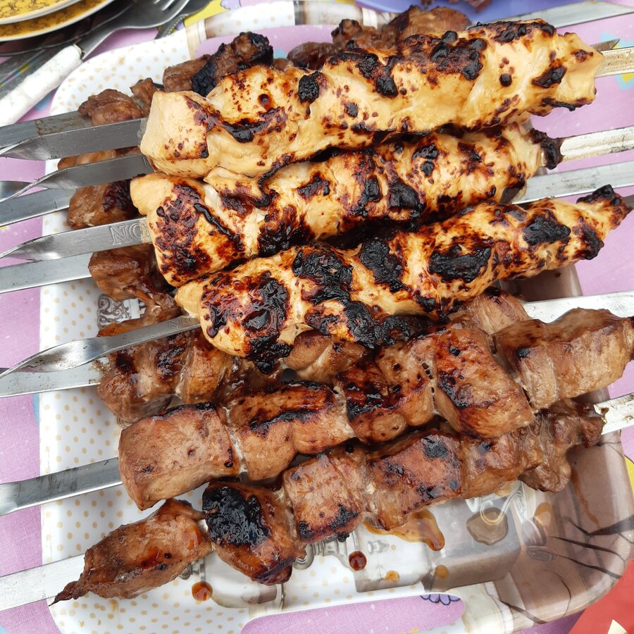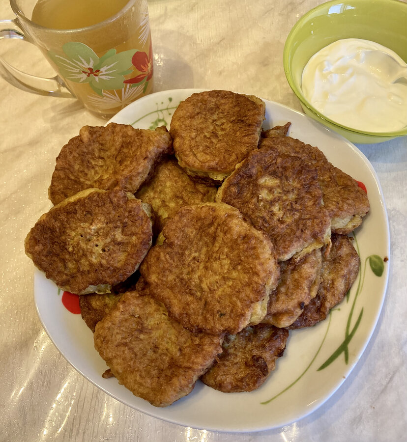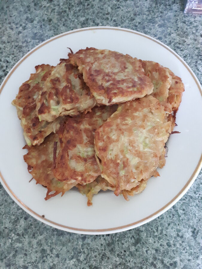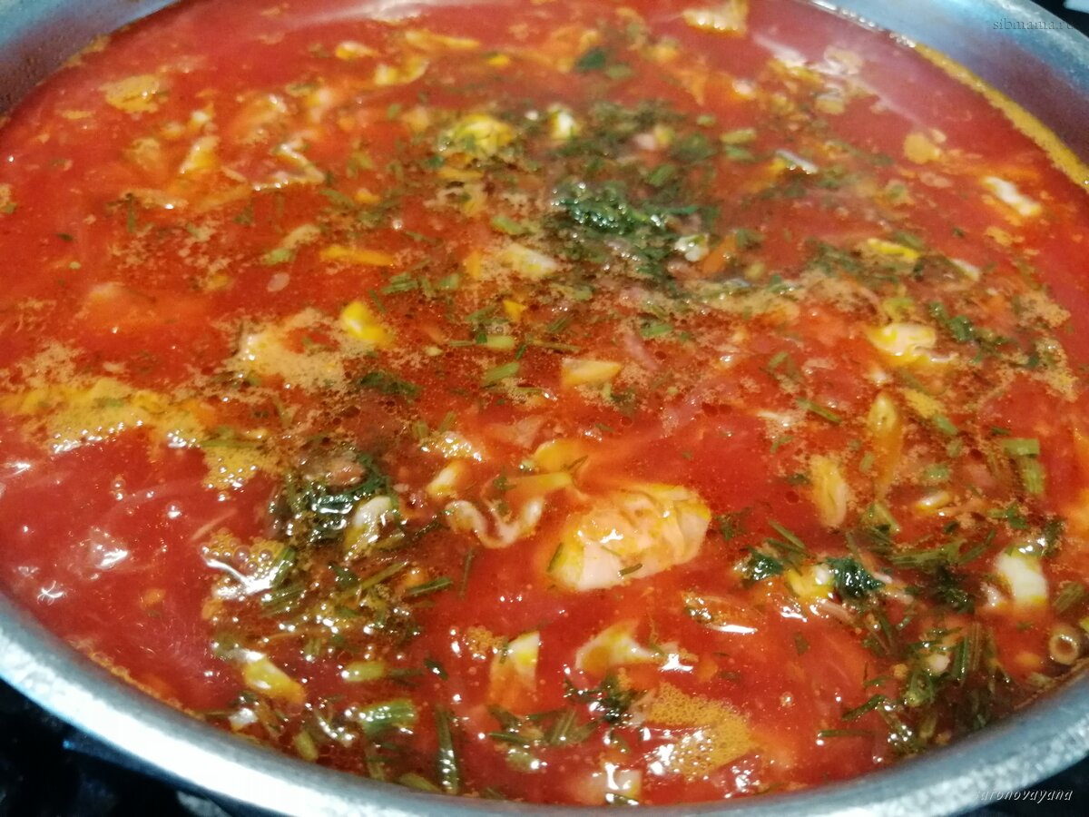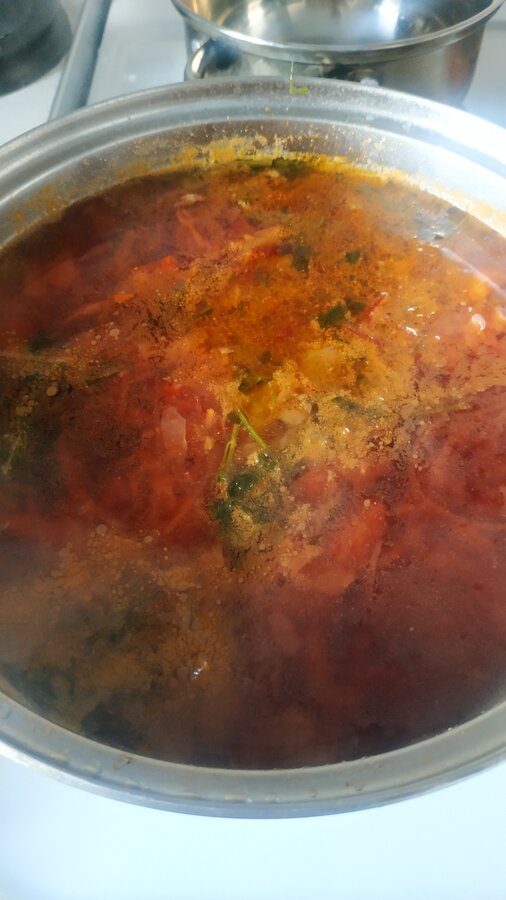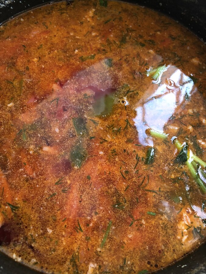 Борщ,грудинка жаренная,куриное филе в кляре и сухарях.