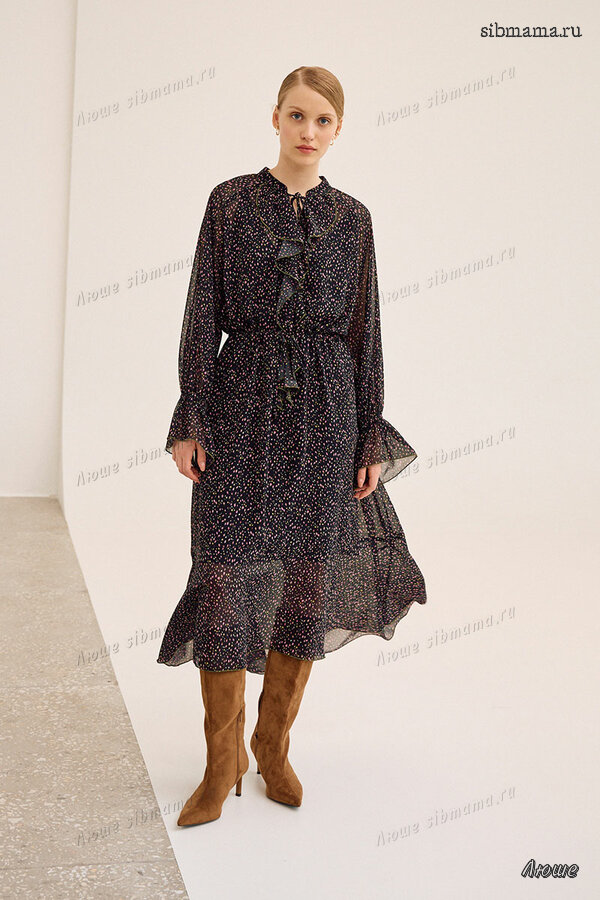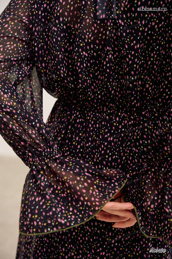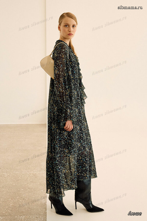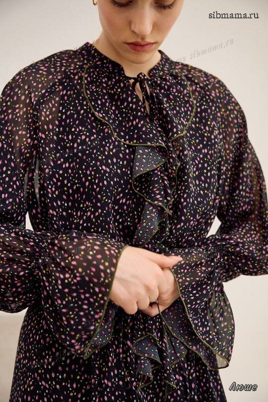 Платье свободного кроя, выполнено из шифона. Рукав длинный реглан, по низу рукава резинка. Глубокий V-образный вырез горловины, в который вставлена рюша, по горловине стойка на завязку, по середине выреза застежка на навесной потайной крючок. По линии талии по переду и спинке кулиса на завязку, по низу платья притачной волан. В комплект входит платье-комбинация из трикотажной подкладки на бретелях.