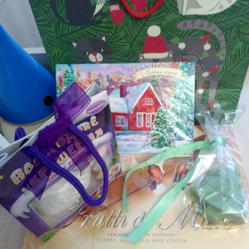 В красивом пакете была очень красивая открытка от Девушки Мороза, коробка с вкусными конфетами (муж со старшим сыном уже положили на них глаз) , красивое мыло елочка ручной работы и набор для раскрашивания гипсовой фигурки.