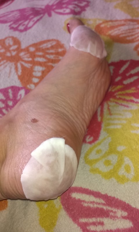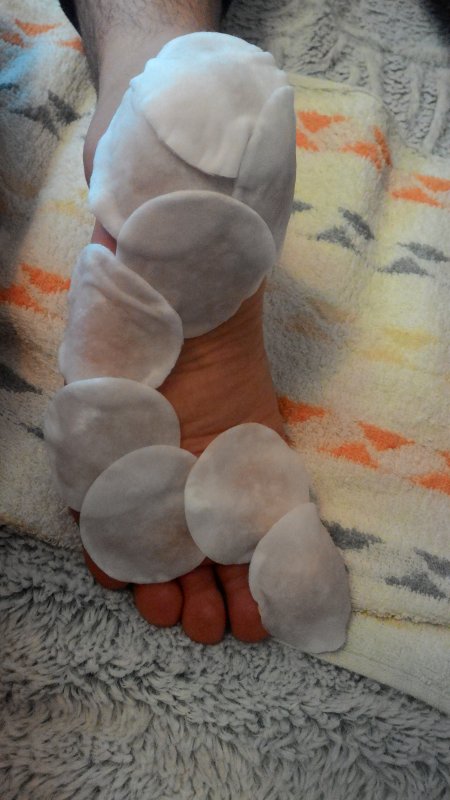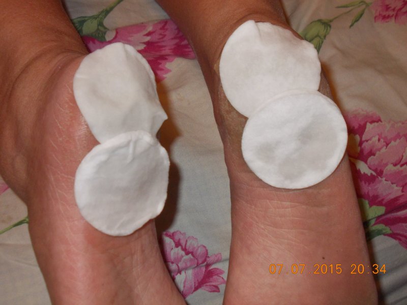 Вот почему-то ватные диски сваливались с моих пяток,я их вроде и смачивала хорошо и плотненько прикладывала,а они все-равно оттопыриваливались---приходилось постоянно их попровлять,