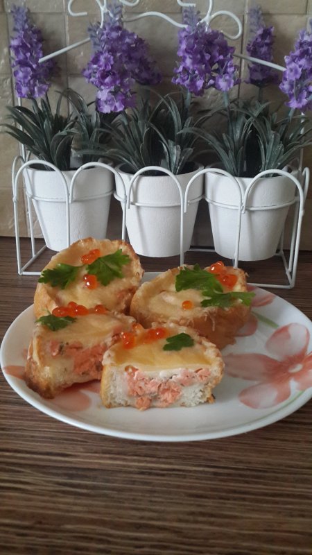 5. Разложить начинку в углубления в батоне. Смазать майонезом.