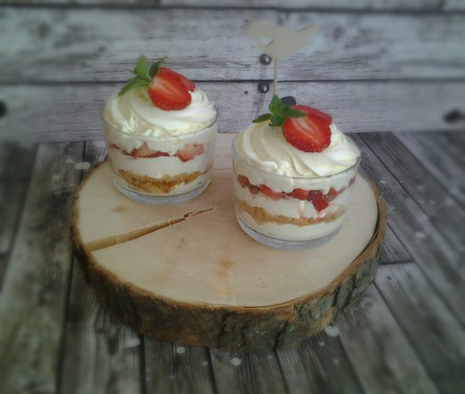 На дно стаканчика немного крема, потом крошка, опять крем. Затем ягода и сверху уже шапочка крема.