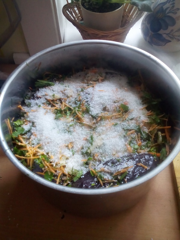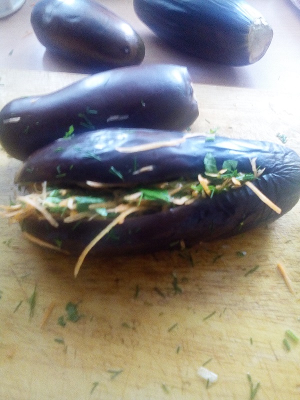 Делала по рецепту Васиной Наташи. Начала в понедельник. Итак: баклажаны немного отвариваем, минут 5-7, затем делаем фарш из зелени, морковки, чеснока. Все режем, перемешиваем