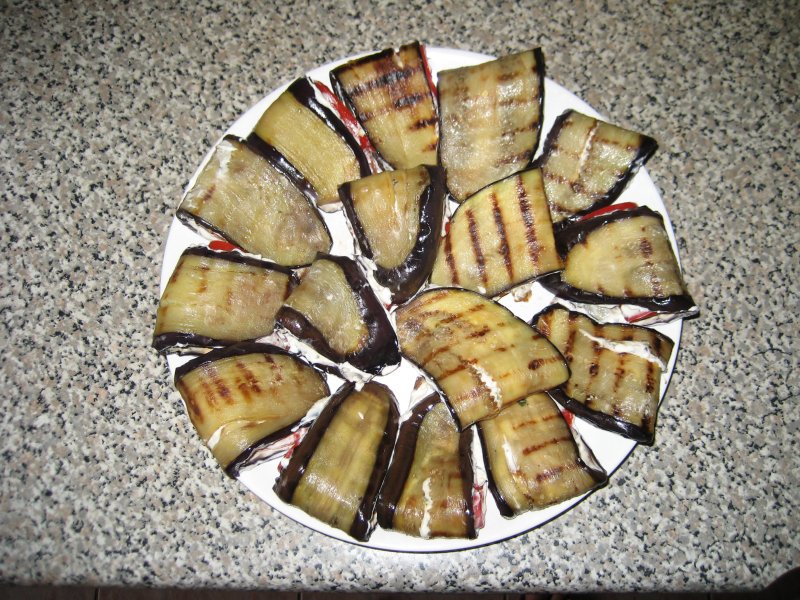 -намазываем соусом ломтик баклажана, кладем 1/4 перца и снова мажем соусом. Сворачиваем рулетик. Рулетики убираем в холодильник хотя бы на 30 минут, лучше дольше.