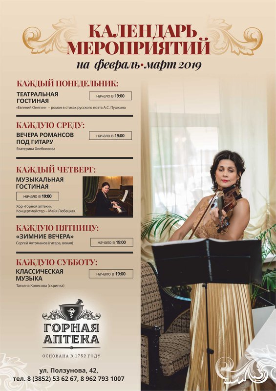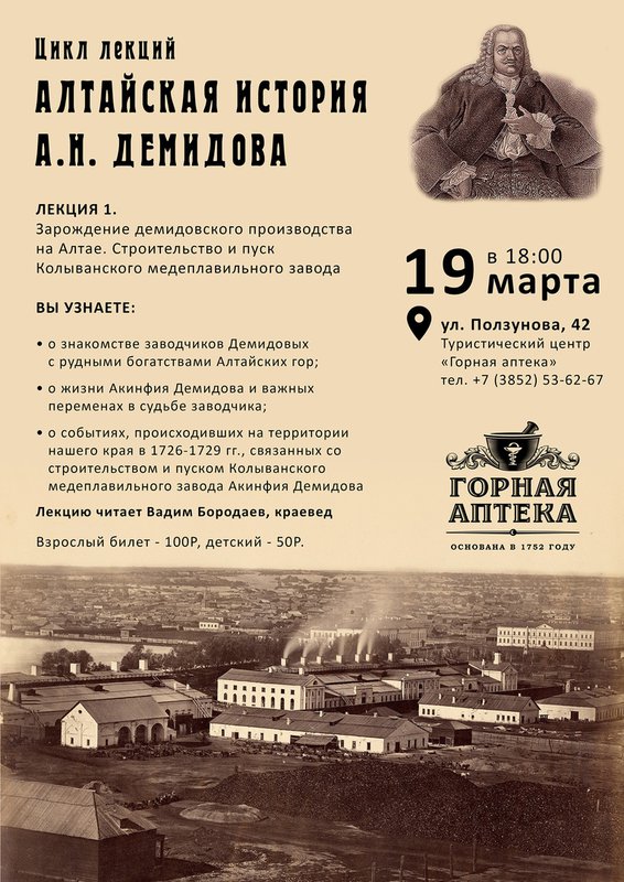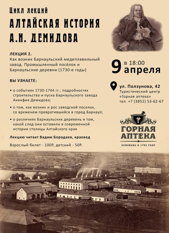 ⚖ Музей истории аптечного дела на Алтае «Горная аптека» открывает цикл лекций под общим названием «Алтайская история Акинфия Никитича Демидова», посвященный деятельности знаменитой династии тульских и уральских заводчиков Демидовых на Алтае.