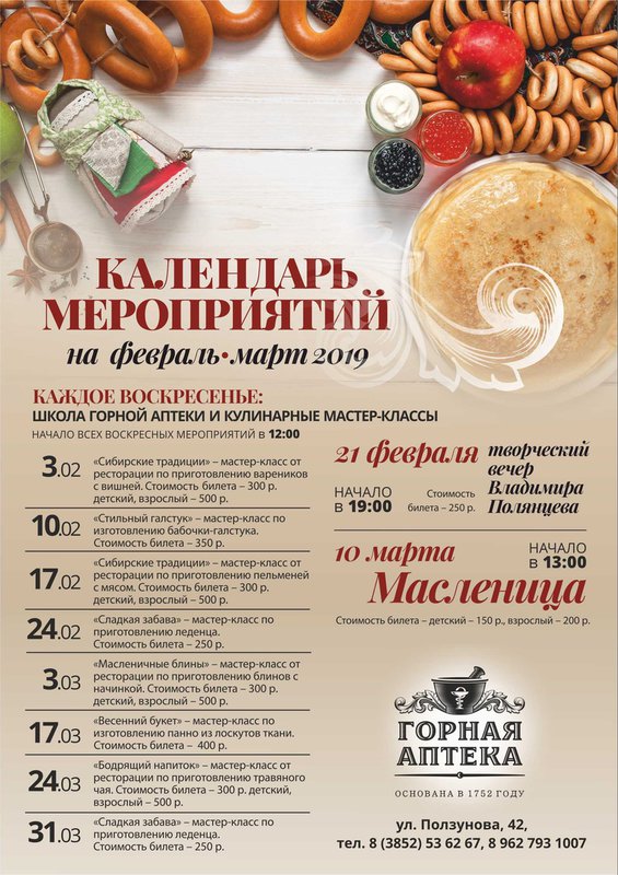 🔸 03.03.19 - «Масленичные блины» - мастер-класс от ресторации по приготовлению блинов с начинкой. Начало в 12:00. Стоимость билета - 300р. детский, 500 - взрослый.