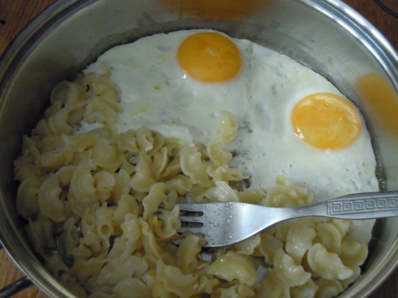 Сковороду на плиту, разогревается на 6 (у меня 6 делений), на не сильно разогретую сливочное масло (настоящее, вкусное..))), как масло разойдётся (сковорода всё ещё не полностью раскалилась), туда макароны (обычно оставшиеся с вечера), перемешать и тут же рядом разбить яйца, чтоб желток целый остался. Сразу посолить и переключить на 2 (или даже 1, если перегрела случайно). Пару-тройку раз перемешиваю макароны, не трогая яйца, чтоб поджарились.