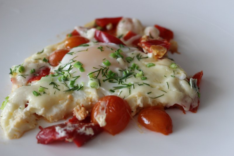 2. Яичница с крошечными помидорками черри и запеченным болгарским перцем, оставшимся с новогоднего стола. Немного зелени и сыра.