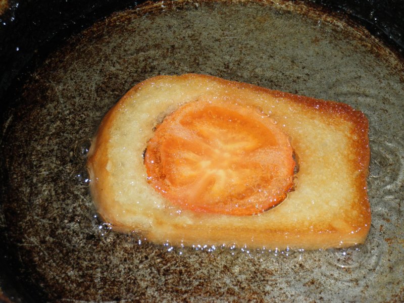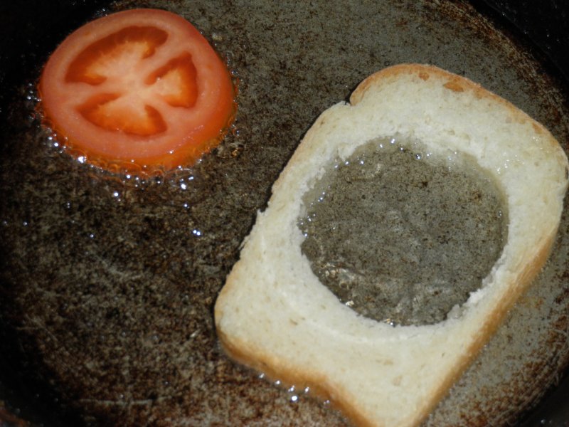 В хлебе вырезаю дырку формочкой, отрезаю ломтик помидорки, обжариваю их с одной стороны. Потом хлеб переворачиваю, помидорку кладу внутрь кружка и сразу разбиваю сверху помидорного ломтика яйцо. Дальше - соль, перец по вкусу, и прикрыть крышкой, чтобы яйцо равномерно "схватилось", готовое блюдо сверху хорошо посыпать зеленым луком. К сожалению, фото поэтапно есть, а финального нет, оно размазалось, из-за пара, а я внимания не обратила. Уже съели, а я сунулась в фотоаппарат, а фото нечитаемое, цветные пятна..