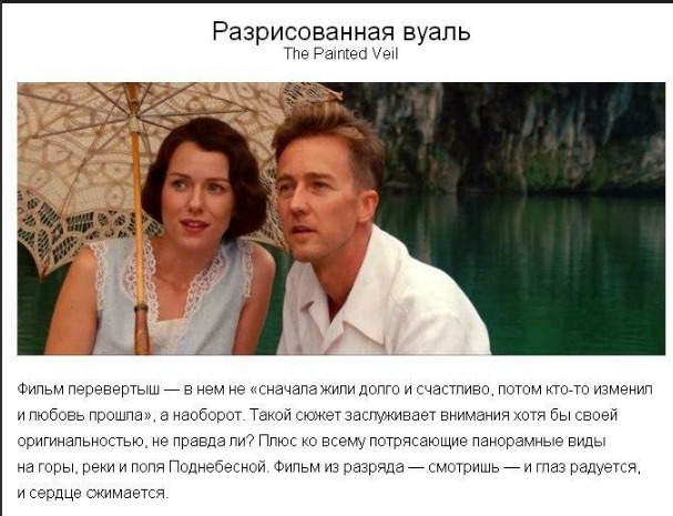 Я хочу порекомендовать кино "Разрисованная вуаль". Меня очень сильно впечатлил. Игра актеров и сюжет.
