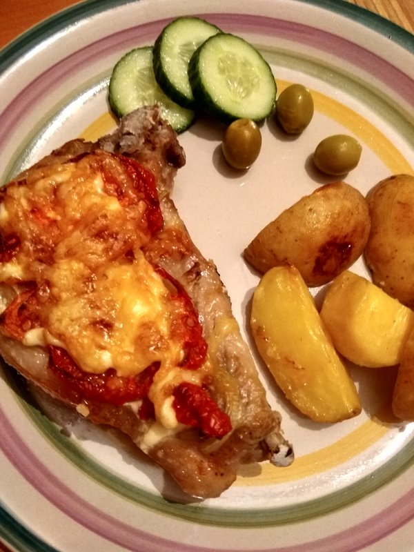 А я на ужин готовила пиццу и ребра свинины запечённые в духовке с луком и помидорами и немного картофельного пюре. И кексы на кефире с брусникой испекла