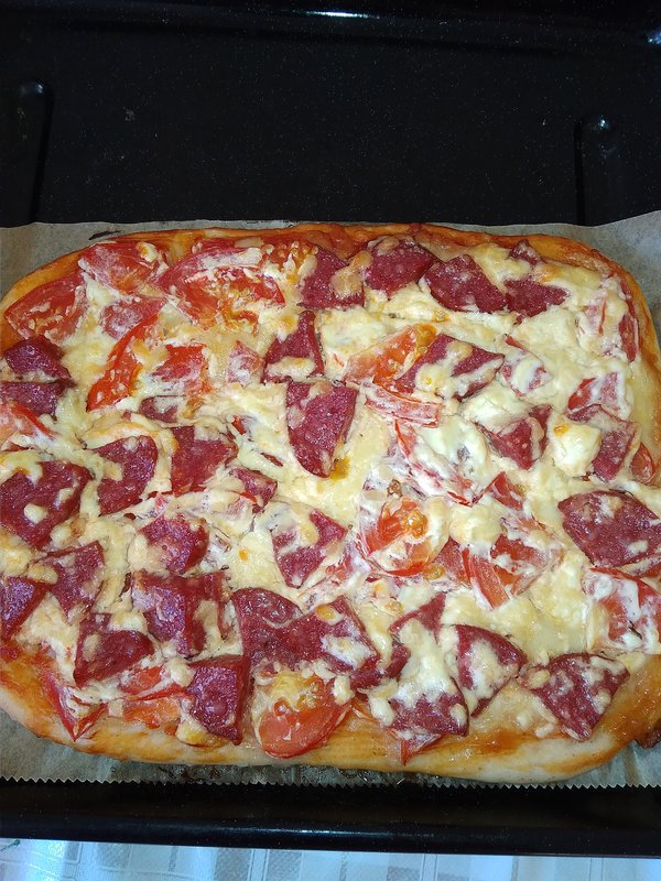 Пицца - лук, колбаса, помидоры, грибы. Сыр добавила за 5 минут до отключения духовки