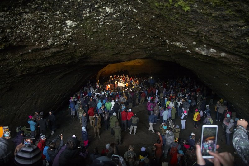 А это необычное мероприятие: концерт в лавовых пещерах. Раз в год, осенью, сотни людей собираются в пещере под вулканом Горелый, чтобы послушать музыку: фортепиано, скрипки, хор, удивительная акустика и необычная атмосфера:
