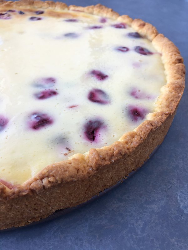 Тесто песочное, сверху творожная начинка, потом ягоды и крошка сверху.