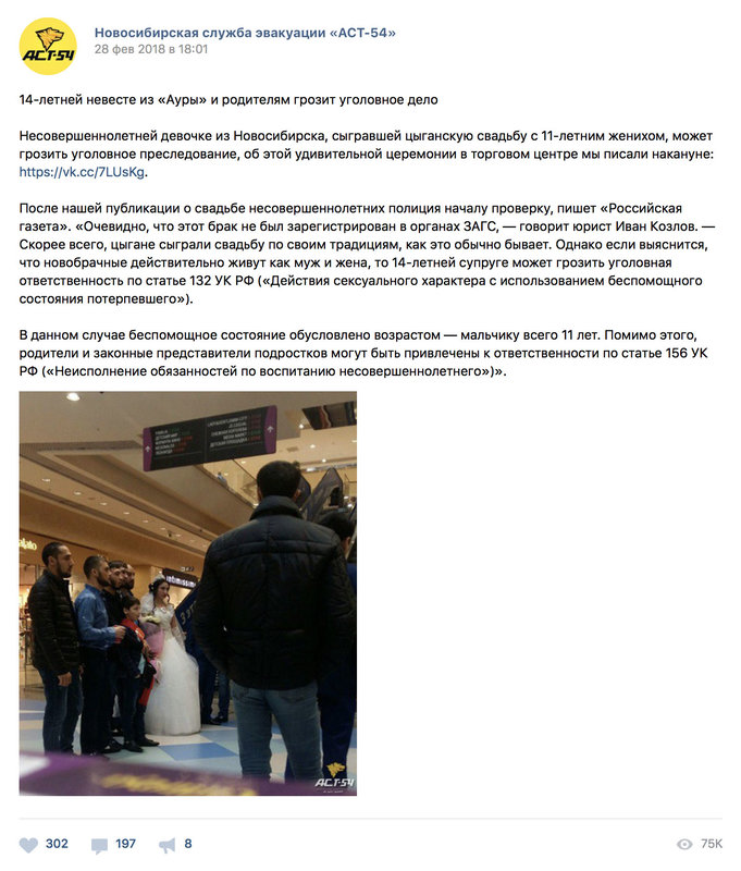 В Новосибирском ТЦ 26 февраля посетители стали свидетелями необычной картины: цыгане провели свадебную церемонию возле эскалаторов между магазинами белья и супермаркетом с продуктами. Жениху — 11 лет, невеста на три года старше. Несмотря на то, что браки в столько раннем возрасте незаконны, цыганские семьи легко и играючи обходят этот запрет. Как им это удается и могут ли такие союзы существовать безнаказанно — выяснил портал iz.ru.