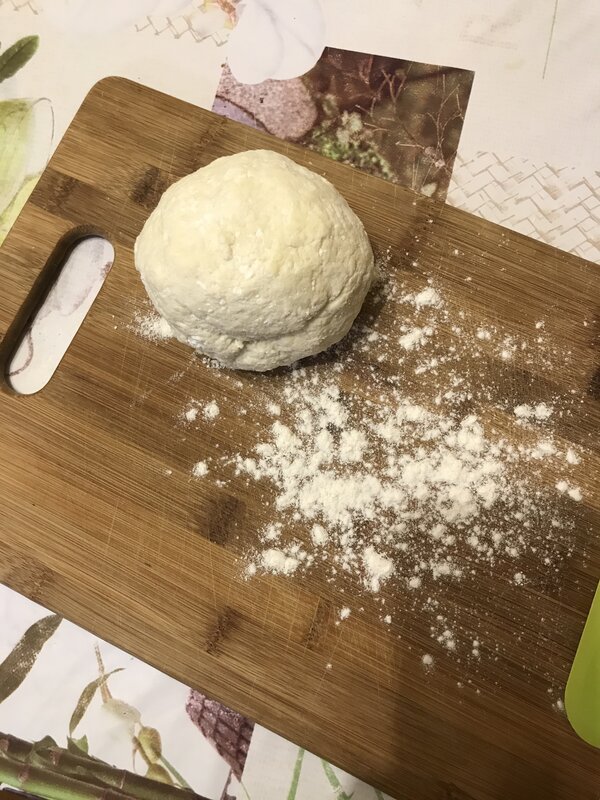 2. Мука 4 ст.л с большими горками и +на присыпку ( в сл.раз добавлю больше муки, не люблю когда тесто липкое, пока проводишь манипуляции присыпать-раскатать-разрезать-обвалять, то уходит много муки, лучше сразу ее в тесто :haha: )