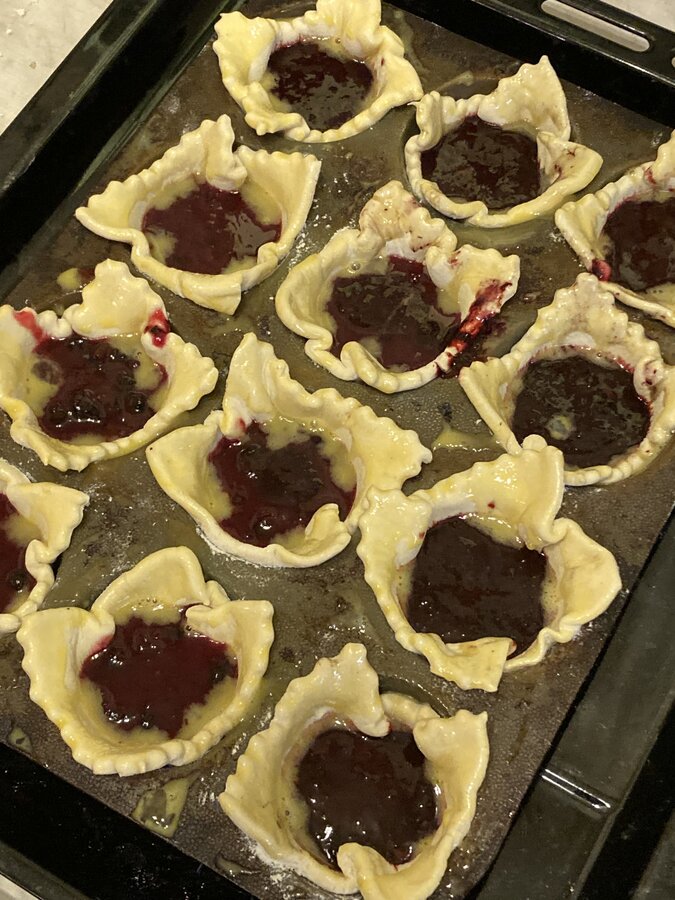 Слоеное тесто раскатать и нарезать на квадраты. Выложить в формочки. Выложить начинку - у меня смородиновое варенье смешала с крахмалом , можно любые ягоды смешать с сахаром и крахмалом и немного проварить или просто так. Я смазала яйцом тесто.