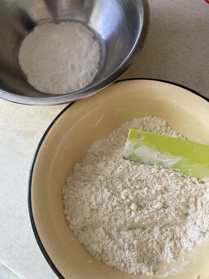Я кладу сразу не всю муку, часть откладываю и добавляю по мере необходимости. В этот раз бухнула всю сразу и зря, моей муки на это количество жидкости многовато.