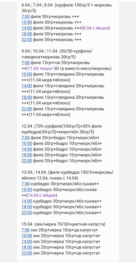 + в миске сырые овощи/фрукты (морковь, кабачок, тыква, огурцы, яблоки...), творог, яйца (я даю перепелиные сырые вместе со скорлупой), зелень. Например 1-2 раза в неделю можно мясную основу заменять рыбой.