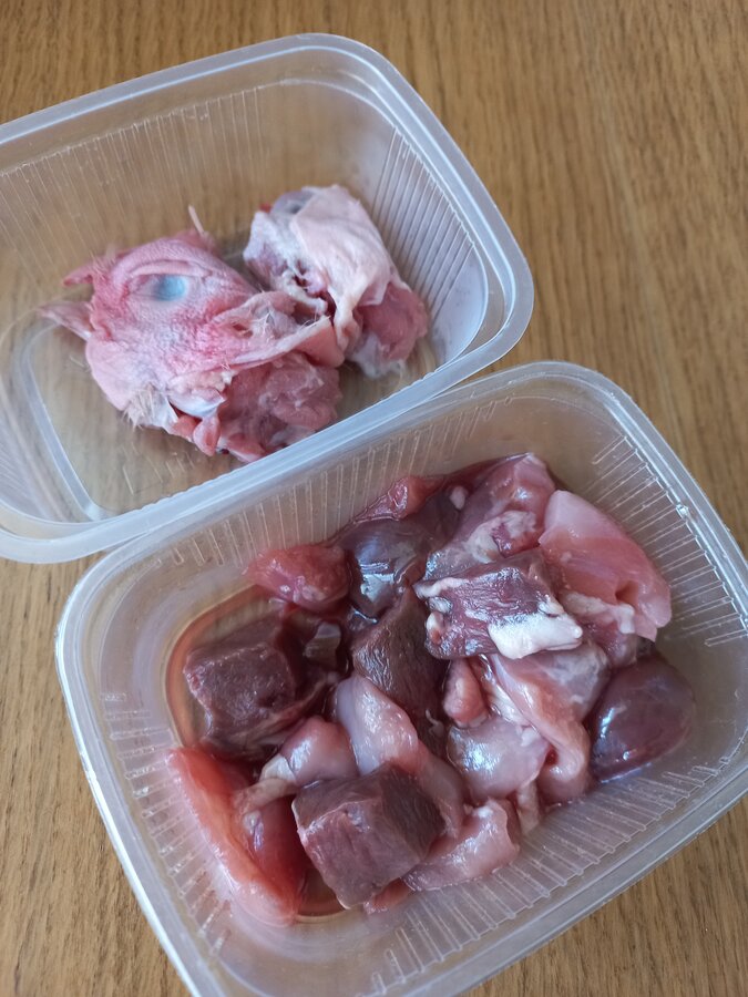 вот так выглядит суточная порция. В одном контейнере филе куриного бедра+говяжье сердце+говяжьи почки. В другом куриная голова))