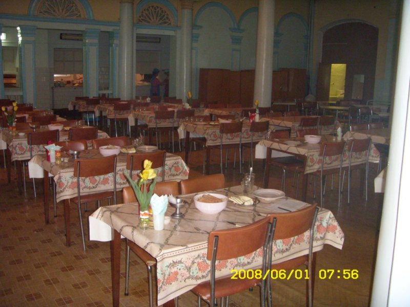 Кормят там на убой, порции большие, поначалу наедались от пуза, потом привыкли и стало нехватать :). Вся пища тушено-варено-парено-припущенная, жареной нет вообще. Наедаешься от пуза вдоволь, но только впритык: от завтрака к обеду и от обеда до ужина. В столовке дают мню на бумажках, где можно составить из представленного "ассортимента" лЮбое тебе меню. Картофельное пюре преобладает. Каши, омлет, капуста, тефтели, гуляш, курица, печень, яблоки или апельсины на каждый обед, кефир, компот, чай из шиповника, какао было только однажды, а вот кофе отсусссствует напрочь (как вариант, покупать на Пятаках пакетики 3в1 и брать с собой в столовку).