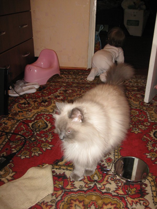привезли мелкую из роддома - а он забоялся! стал тише воды, ниже травы. я, конечно, постоянно из детской его шугала и строго приговаривала, чтоб не смел даже смотреть в ее сторону. к младшей он не лез, старшую обижал, меня тоже иногда хватал :aga-aga: . но я в гневе страшна - поймаю его хоть где, хоть как, отлуплю (муж даже кусал его за ухо :lol: ) и на балкон в любое время года.
