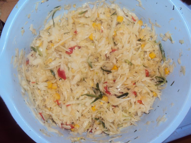 Капуста белокочанная (нарезала, обдала кипятком, помяла с чуть-чуть соли)