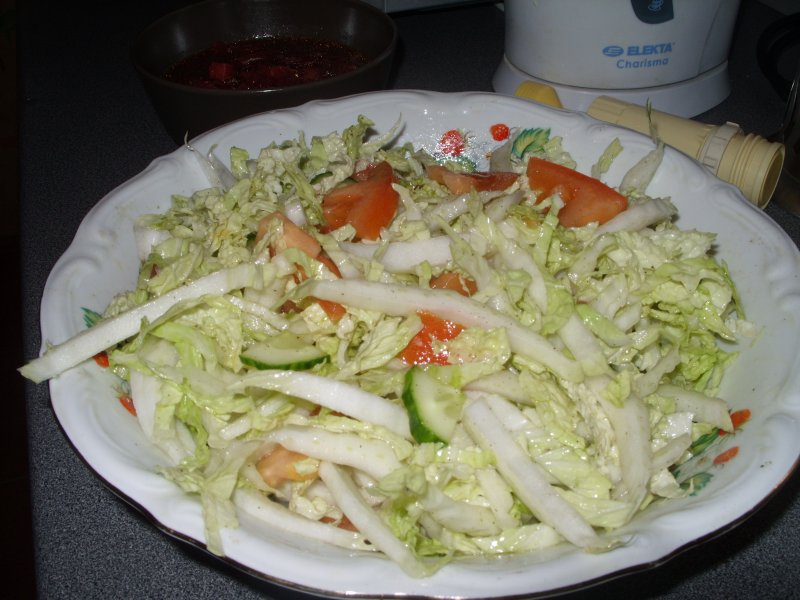 все просто,главное капустку пошинковать потоньше,а к ней что уж есть в наличае :морковку сырую,огурчик зеленый,перчик болгарский (у меня был замороженный)помидорки свежие,зелень ,можно яблочко ,и как вариант добавить кукурузу сладкую консервированную(но мне не понравилось больше добавлять не буду)выдавить сок лимона (у меня был лайм,с нового года еще остался) НЕ СОЛЮзелень -по вкусу -любая ,и специи -очень люблю семена зиры с капусткой :proba: все полить маслом оливковым или какое нравится-я делаю салат-без соли и в ТАЗИКЕ :oops: