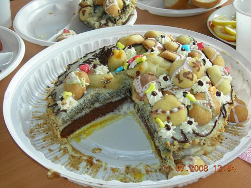 Коржи бисквитные: белый, с какао, с маком. Попробовала новую начинку: крем заварной фирмы HAAS + взбитые сливки 200 мл. На нижний корж положила 150 гр. мелко нарубленного кумката. Очень аппетитно выглядит, на вкус никто не опознал - что это...