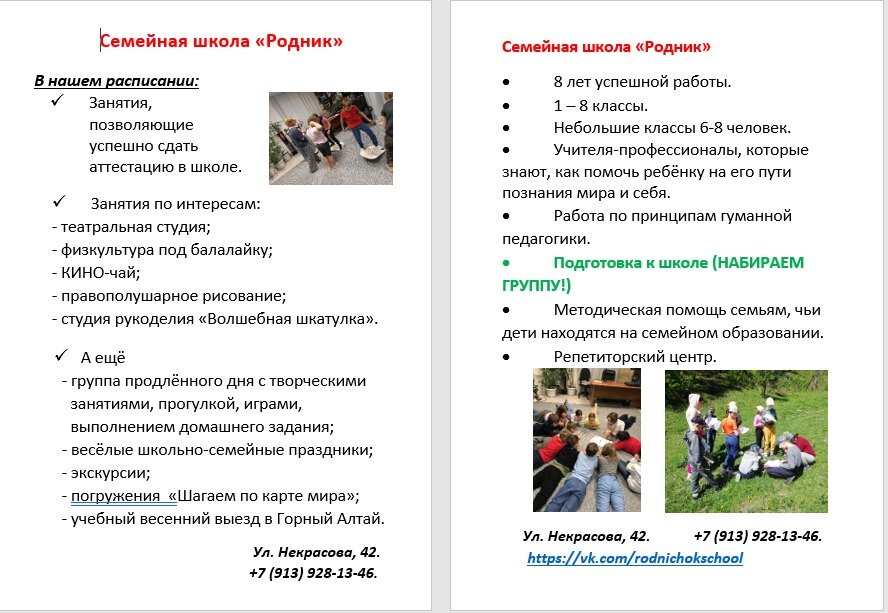 Здравствуйте, мамы! Если вы всё ещё в поиске семейной школы/малокомплектных классов для своих детей, приглашаю вас познакомиться с нашей семейной школой "Родник". Находимся в трёх-пяти минутах ходьбы от ст. метро "Заельцовская" по адресу Красный проспект, 153а.