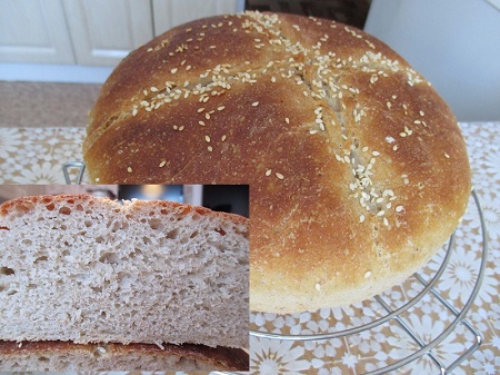 Если в рецепте батона с кунжутом на закваске, заменить 40 г ржаной муки на 50 г овсяной, плюс добавить 1,5 ч.л. соли, 1 ст.л. сахара и 1 ст.л. горчичного масла, то получается вот такой хлебушек